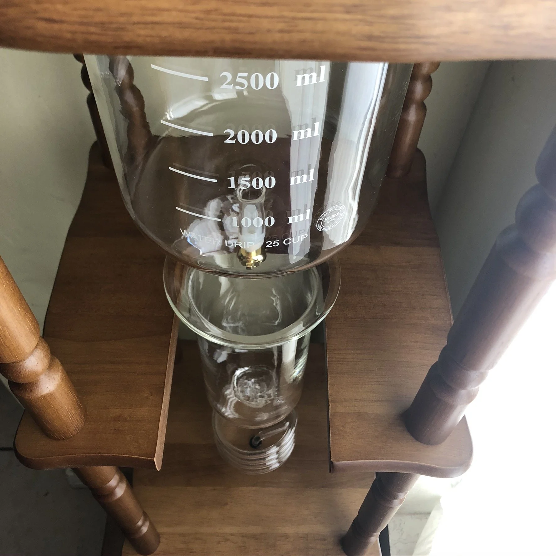 Ice water slow drips through Beal Beans coffee in a Yama cold brew tower.